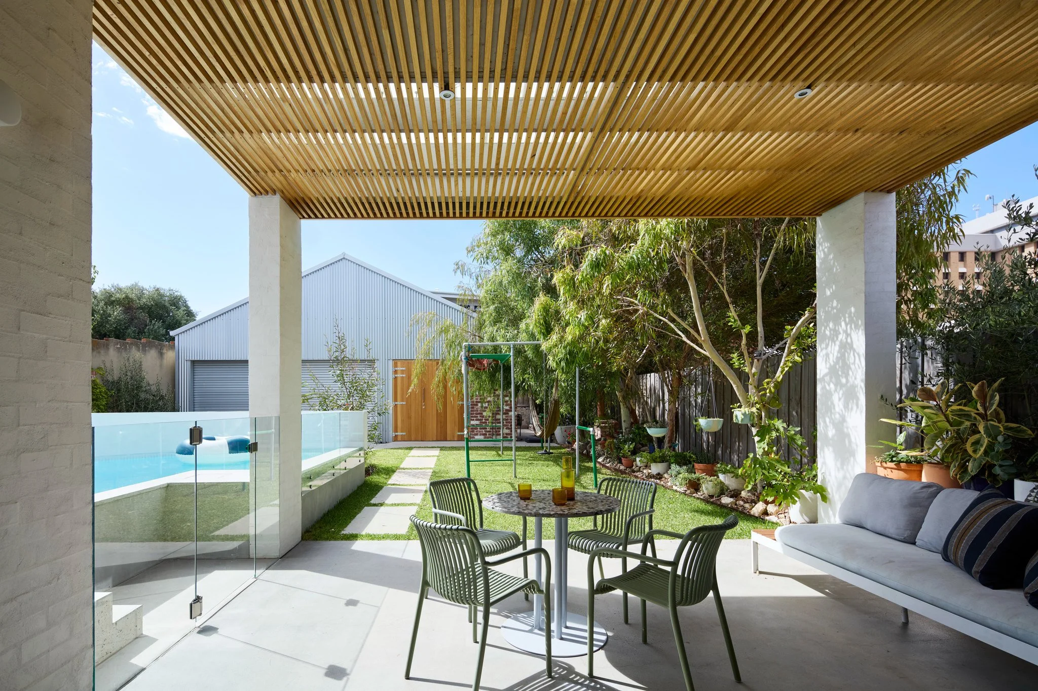 The design incorporates a large shed at the end of the yard, this was an innovative inclusion that was achieved very cost effectively as Cast explored companies that would allow for customization. This shed echoes the Fremantle Port in its roof pitch and provides a flexible space for creative and active pursuits.