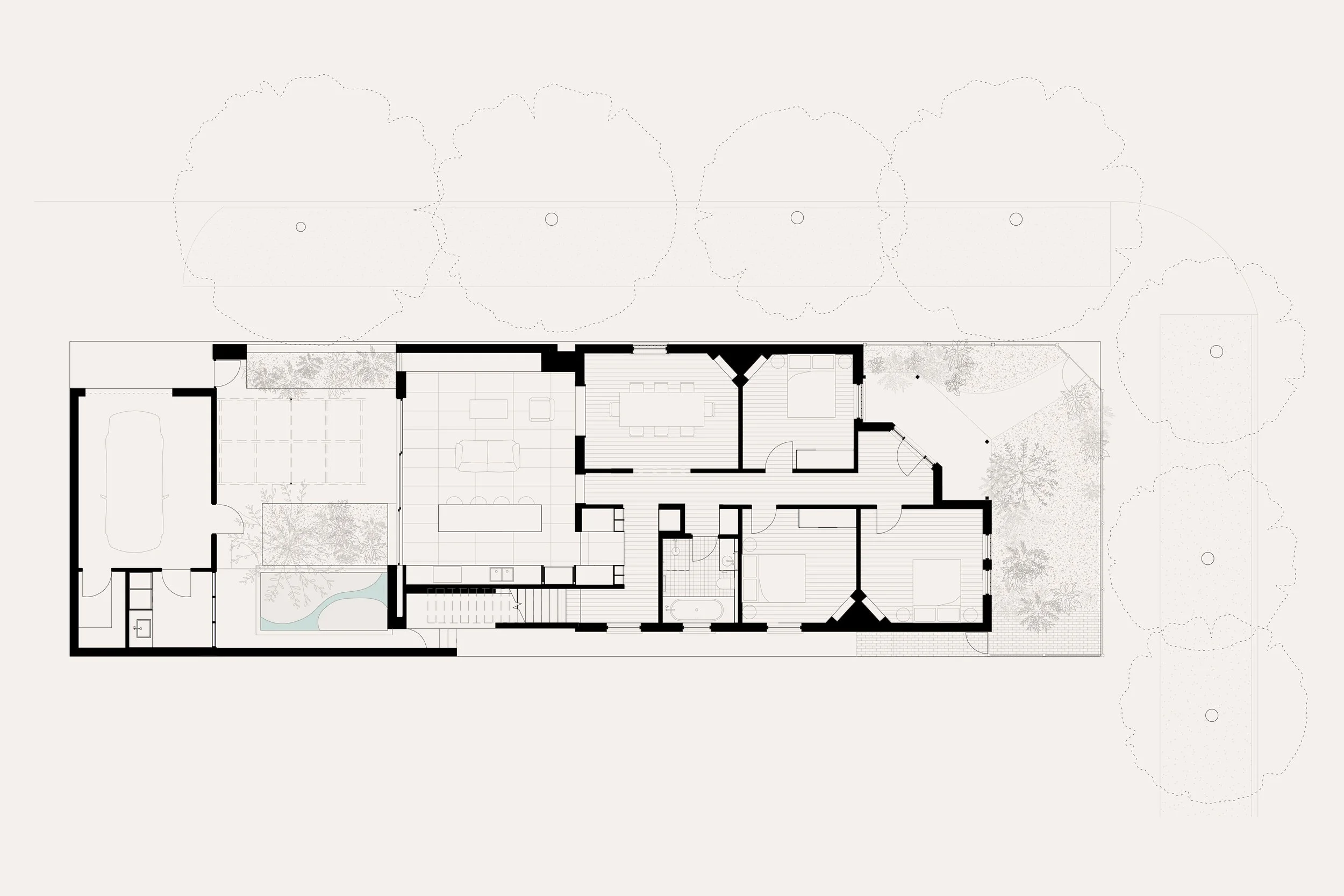 Built up to its side boundaries on a 330-metre corner lot, the home had been in the family for years but was dark and pokey, with poor connection to the small northern garden. Working to counteract this, a grafted extension has a porous connection to the existing house, breaking down the previous logic of a single corridor and bringing daylight deep into the house. A glazed cavity sliding door disappears, creating a seamless connection between a new living area and the adjacent outdoor area.