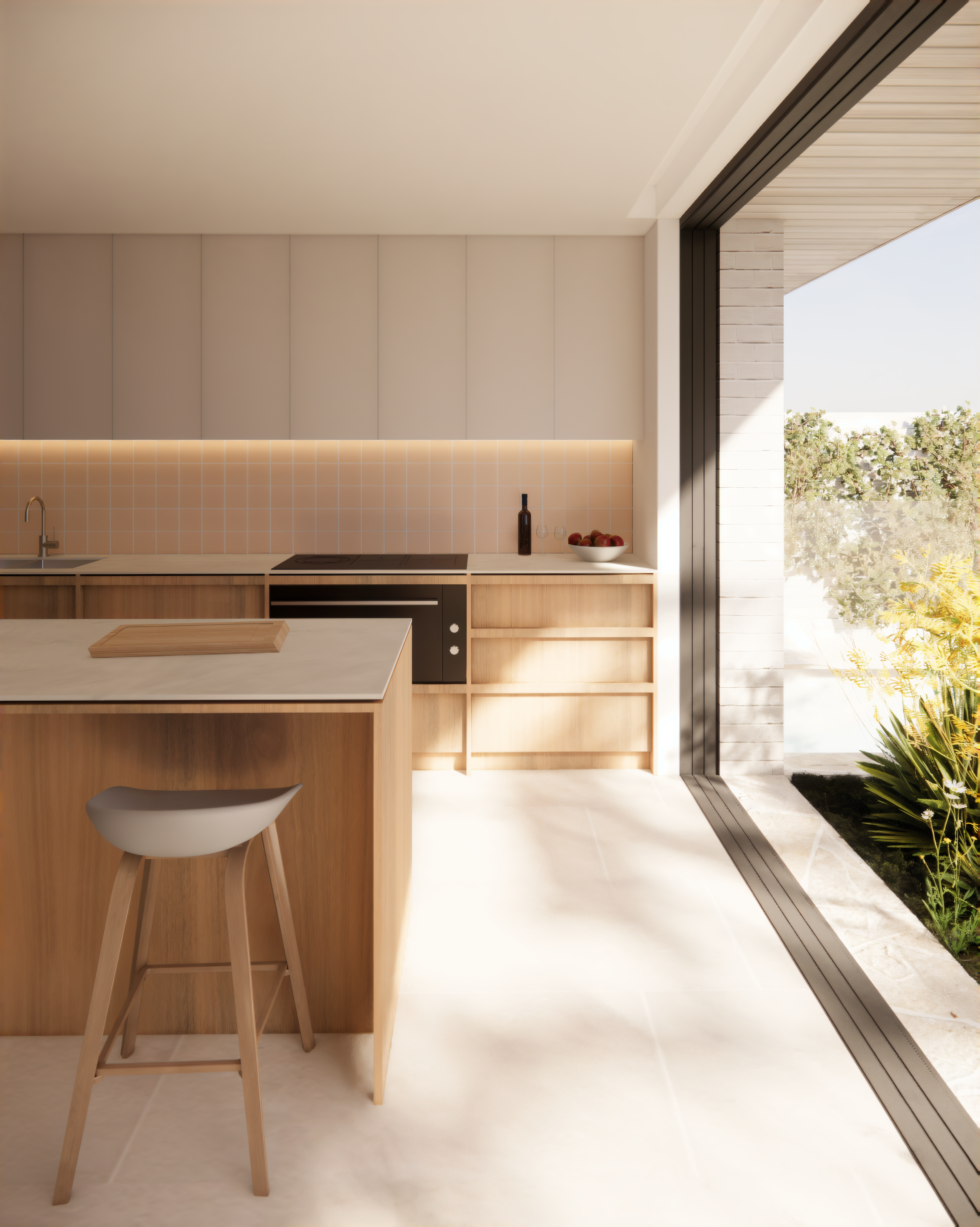 The design is efficient, with the construction budget working hard, but our clients were not afraid of having fun with material selections – Square pink tiles in the kitchen splashback demonstrate a commitment to light, playful spaces. Elsewhere a mix of spotted gum timber veneer and matt laminate cabinets balance beauty, cost and hardwearing functionality. Porcelain floors extend from the living areas through to the external dining area in a flush plane that links internal and external spaces, the house’s brick wall extending to become a protective boundary wall that ends with a four-metre-high decorative pier.