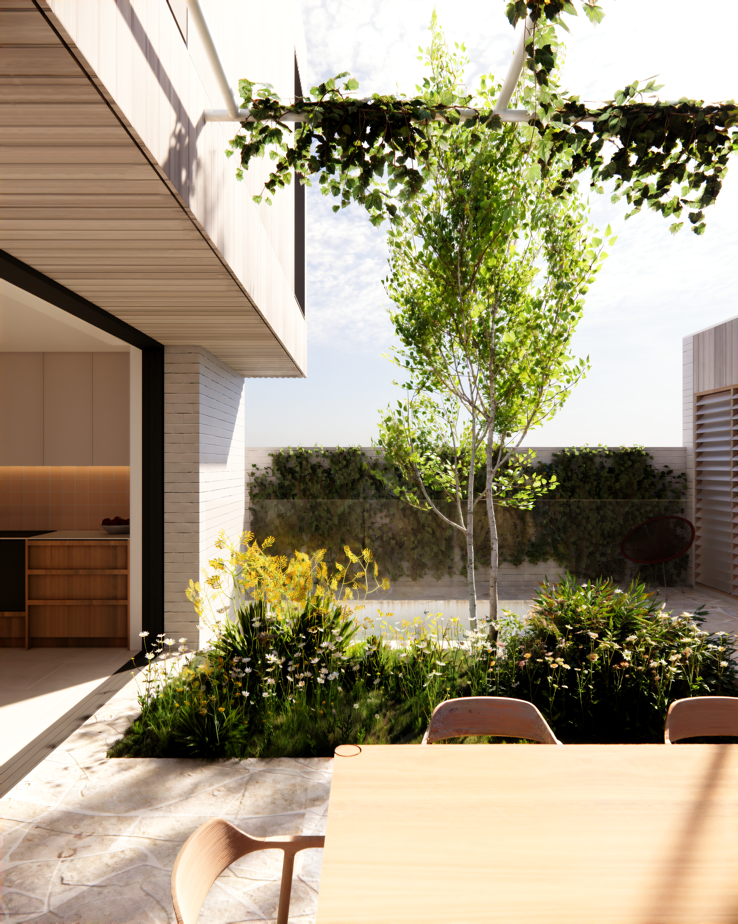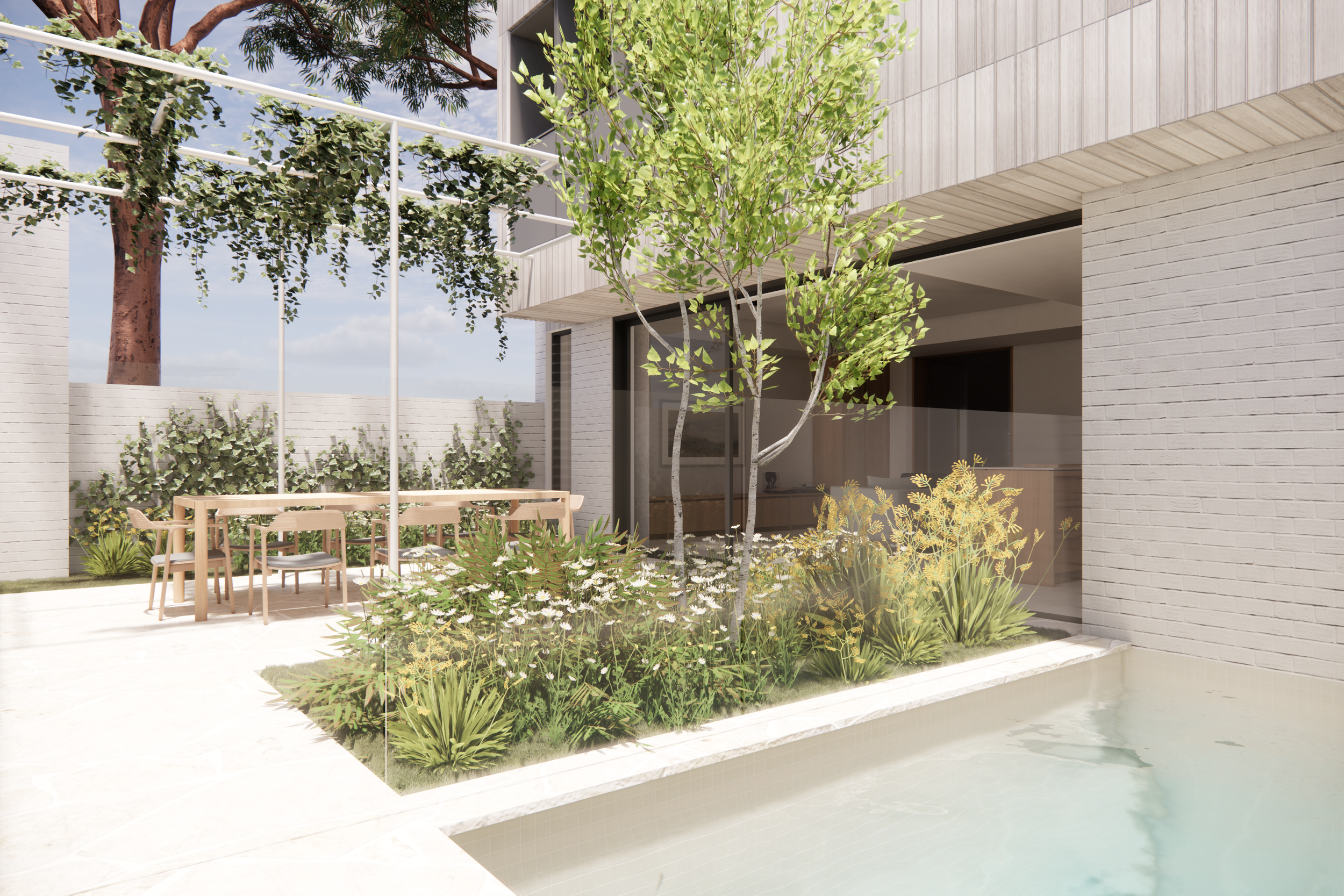 Beyond the courtyard and plunge pool, a disconnected single-car garage with laundry and additional storage completes the project, functional additions that keep a focus on retaining the house within the family as small children grow and requirements evolve.